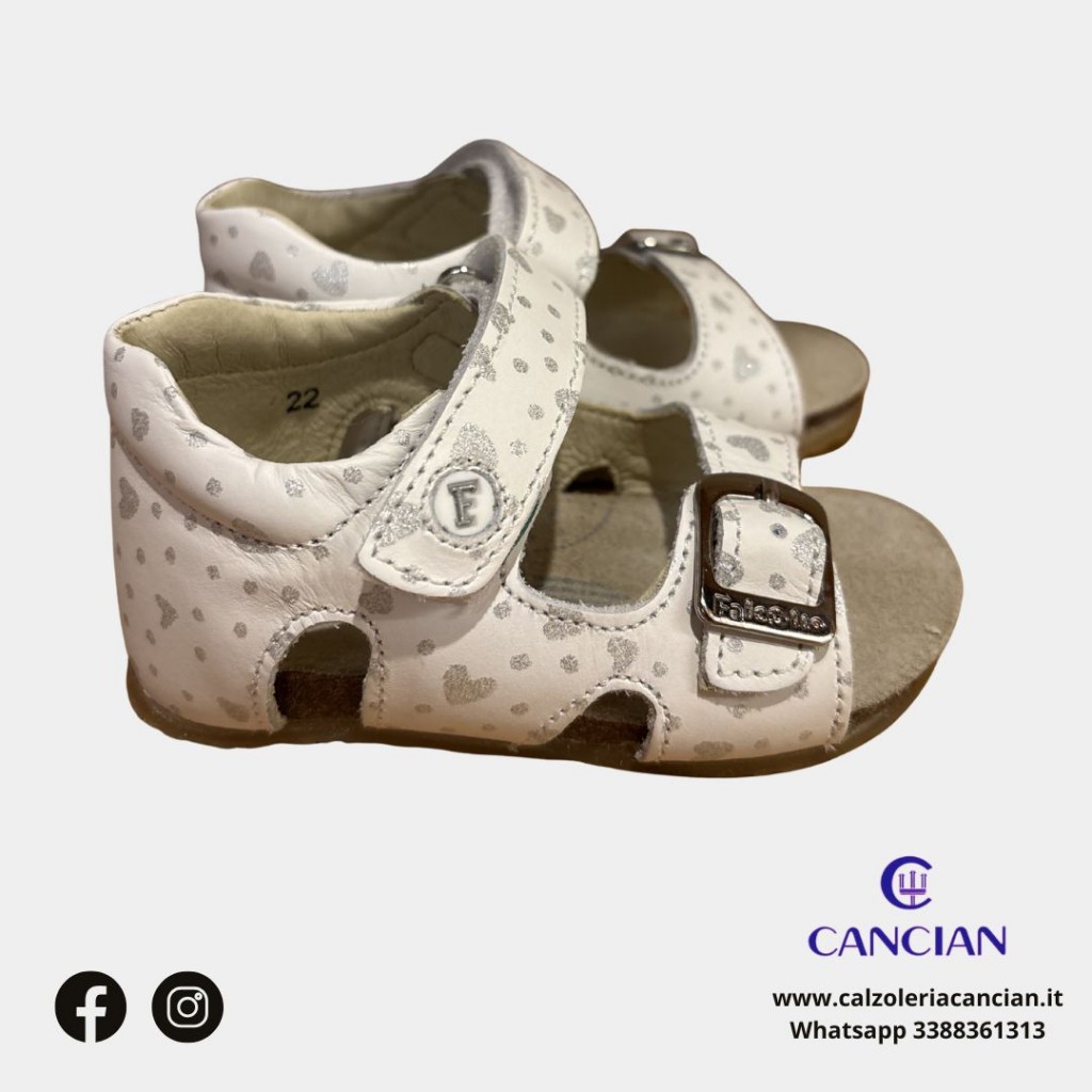 SANDALO PRIMO PASSO, STRAPPO, TALLONE CHIUSO, PELLE CUORICINI ARGENTO.
