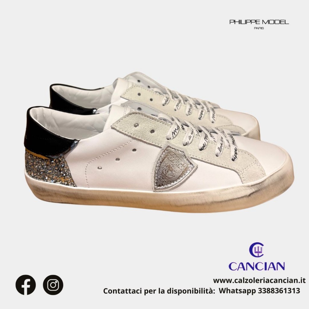 SPORTIVA PELLE BIANCA, TALLONE PELLE NERO E GLITTER ARGENTO, SCUDETTO ARGENTO, LACCIO BIANCO LOGATO.