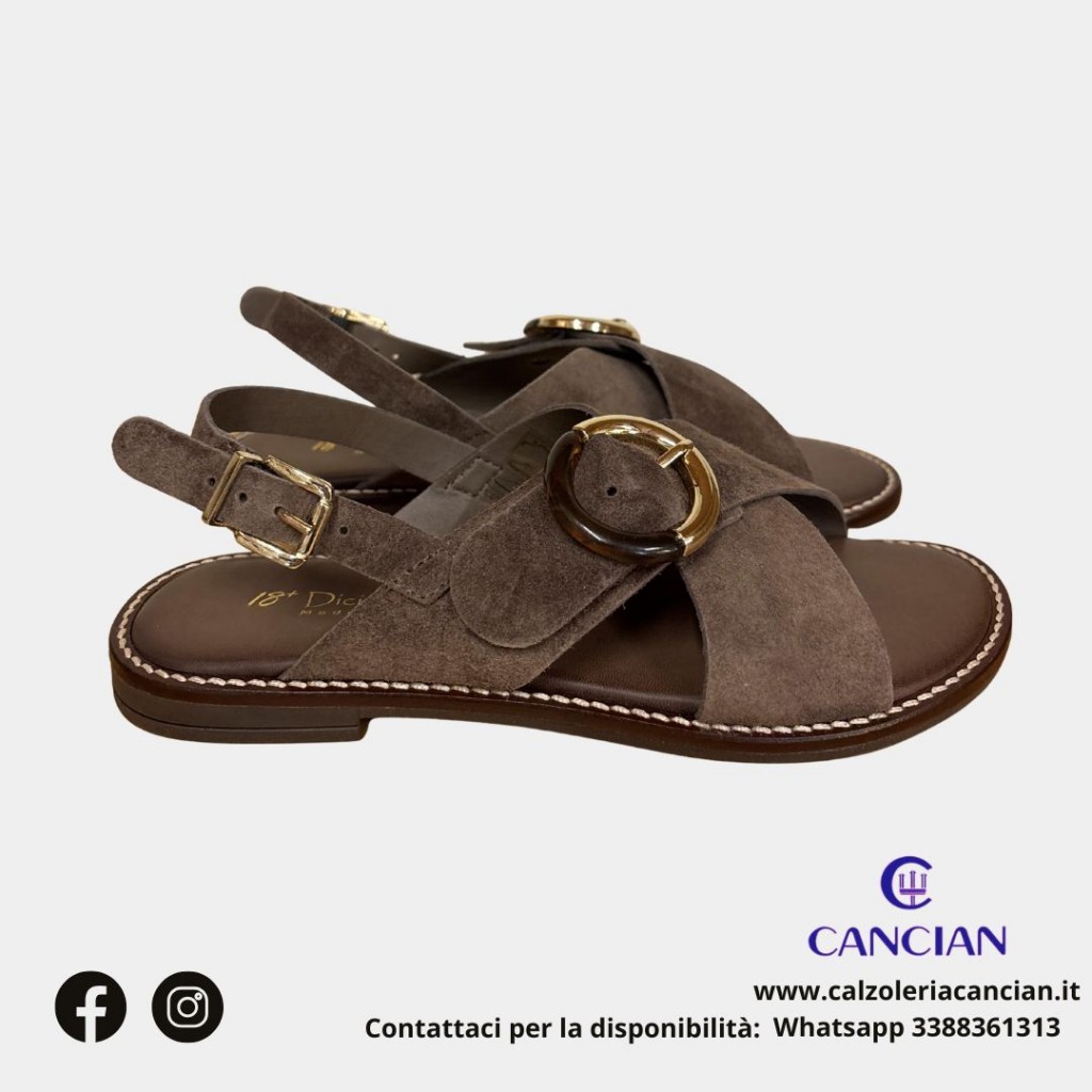 SANDALO CAMOSCIO, FASCE INCROCIATE CON ACCESSORIO, CINTURINO REGOLABILE.